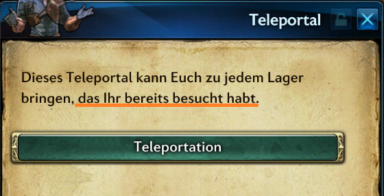 5. Februar 2024 um 18:56 #1 In den Texten der Teleportale steht: Allerdings muss man diese Lager nicht besucht haben, das ist faktisch gelogen.Easy Fix:> Dieses Teleportal kann Euch zu jedem Lager in dieser Region bringen.