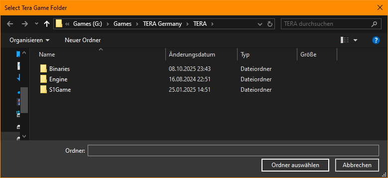 Der Pfad "G:\Games\TERA Germany" zeigt dies: