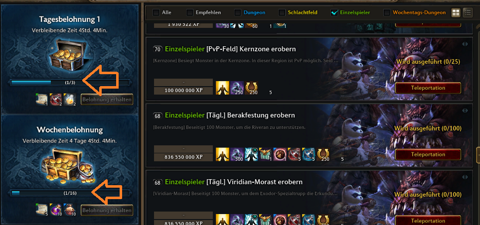 Da steht unter Tagesbelohnung 1 verbleibende Zeit 18 Stunden 19 Minuten