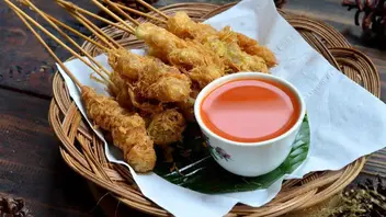 Its just fried eggs on hot oil then u rolling with stick, there many ppl making lot of $ only selling these and funny things vendor of this snack always crowded, they so cheap ($0.12). You can find how simple make this in youtube. Those red sauce not spicy its bit sweet.