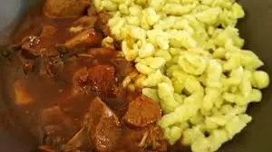 Eierspätzle mit Gulasch