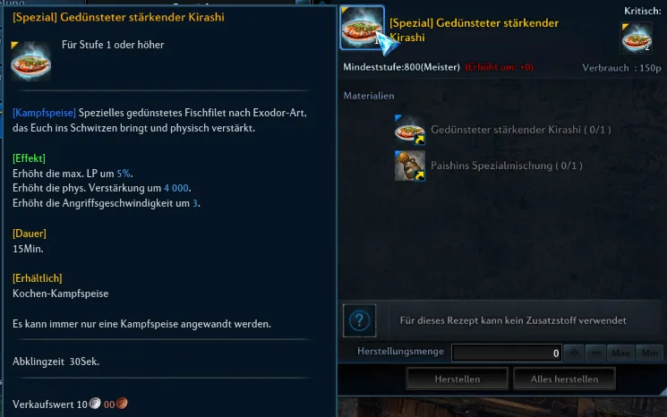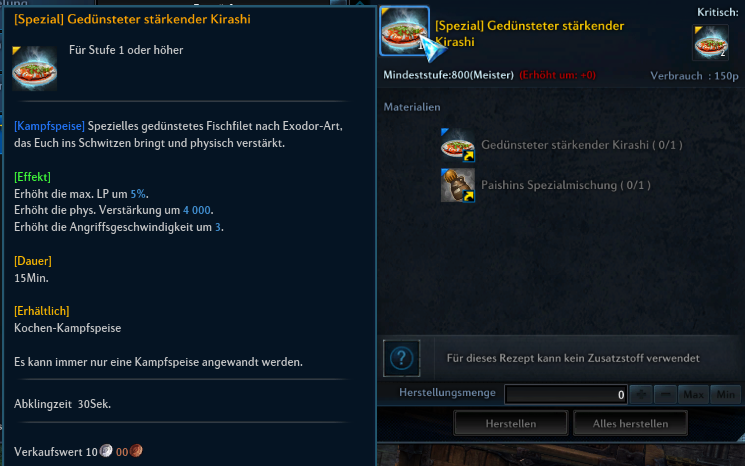 Ich wollte mal verschiedenste Bufffoods ausprobieren die man craften kann und war überrascht über den Kostenvergleich von Beispielsweise 1x "[Spezial] Gedünsteter stärkender Kirashi" und 1x "Starkes Fischgericht"