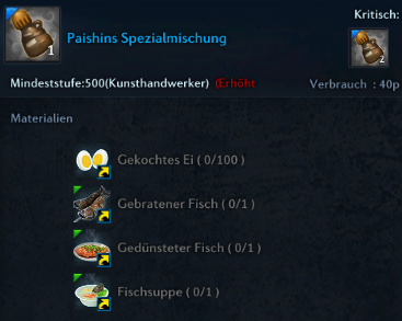 Was den Preis so enorm in die Höhe treibt, sind die sagenhaften 100 Stk "Gekochtes Ei" die man für eine einzige Spezialmischung braucht. Das alleine macht schon 2.140 Gold für ein einziges "[Spezial] Gedünsteter stärkender Kirashi" aus.