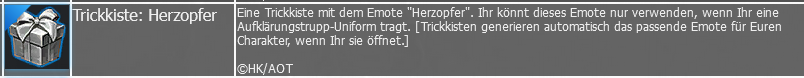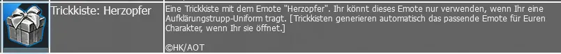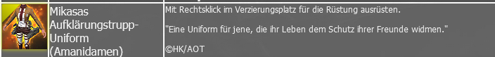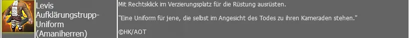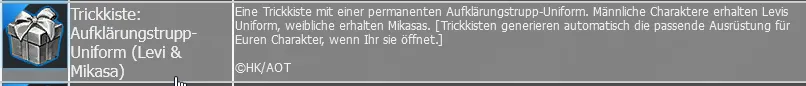 Levis & Mikasas Aufklärungstruppuniform (für jedes Volk und permanent). Des weiteren würde ich mich über das Sonderemote "Herzopfer" freuen, denn das gehört dazu