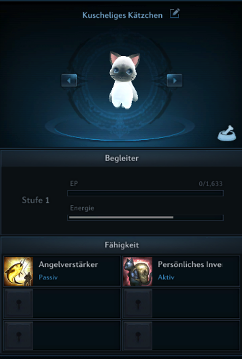 Allerdings ist mir aufgefallen, dass nur das Kätzchen keine Fähigkeit "Selbstversorger" hat. Alle anderen seiner Art (Hase, Wolf und Hai) schon. Aktuell macht es daher leider wenig Sinn, die Katze beim AFK-angeln zu rufen, da ihre Energie irgendwann auf 0 fällt und somit verschwindet